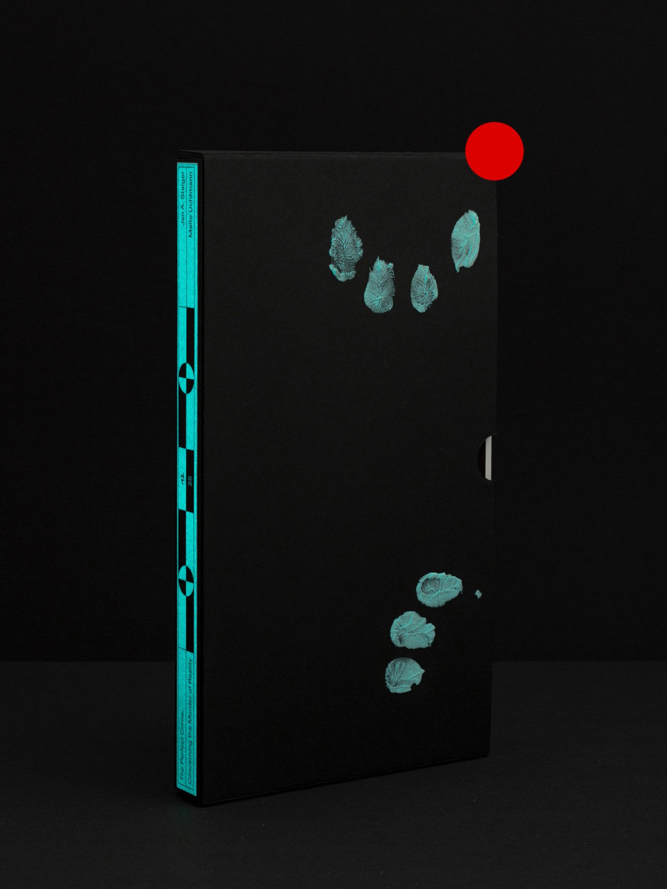 The Special Edition of The Perfect Crime: Concerning the Murder of Reality contains the book in a slipcase, which is screen printed and uniquely handled with glow-in-the-dark UV ink by the artists Jan A. Staiger and Malte Uchtmann. During the day, the ink is charged if exposed to light, which consequently makes the slipcases glow during the night. The concept refers to the use of ultraviolet light at crime scenes, in order to make traces of bodily fluids visible to the naked eye.